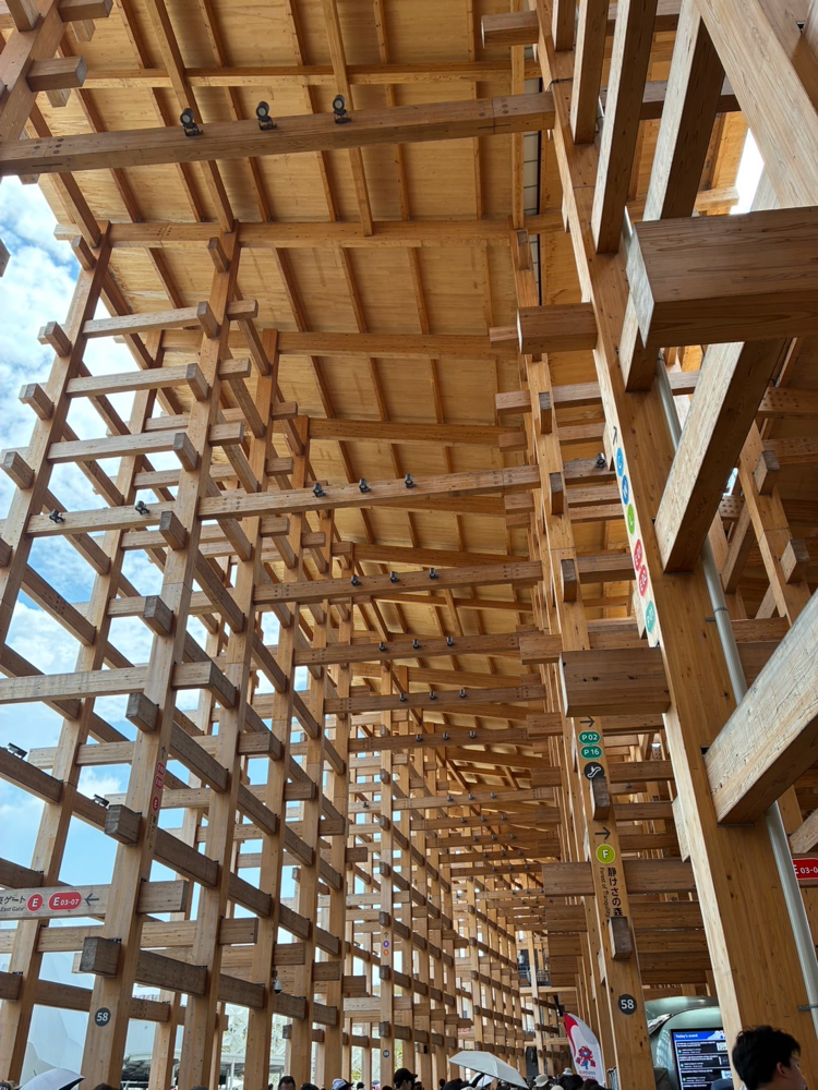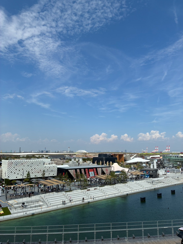 大屋根リングからの景色に、リングの下から覗いてみてと、ちょっと遠くにミャクミャクに…